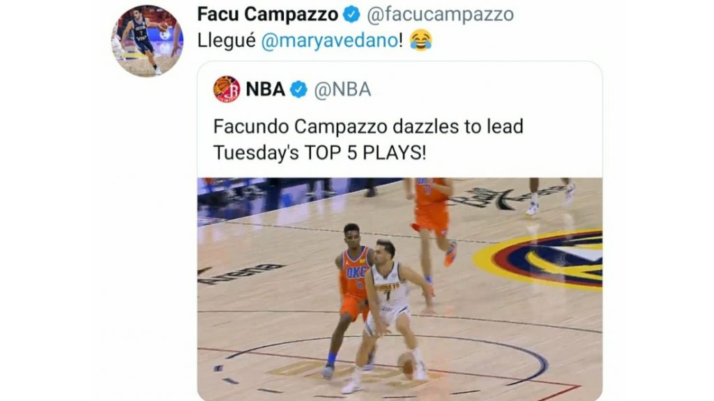 La NBA eligió una tremenda asistencia de Campazzo como la jugada número uno del Top 5 de la jornada y él se lo dedicó a su mamá con un mensaje vía Twitter.