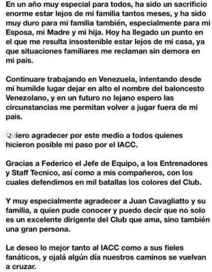 “Continuaré trabajando en Venezuela, intentando desde mi humilde lugar dejar en alto el nombre del baloncesto Venezolano, y en un futuro no lejano espero las circunstancias me permitan volver a jugar fuera de mi país. Quiero agradecer a todos quienes hicieron posible mi paso por Instituto. Gracias al jefe de equipo, entrenadores y staff técnico, como así también a mis compañeros, con los cuales defendimos en mil batallas los colores del club. Les deseo lo mejor y ojalá algún día nuestros caminos se vuelvan a cruzar”, agregó el venezolano en su escrito de despedida.