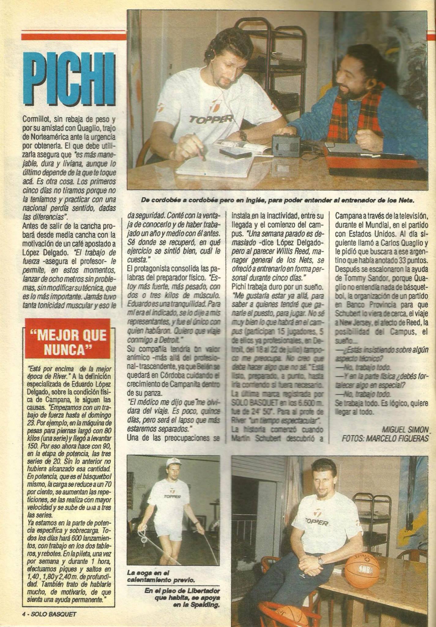 * Fragmentos de la nota de Miguel Simón en Sólo Básquet«Ya habían pasado, antes de aquella sesión de complementos, los 600 lanzamientos matinales. Ya había estado tres horas con Luís Suárez, 38 años, cordobés, profesor de inglés, quien hace diez años que vive en Capital Federal tras una larga residencia en Londres»